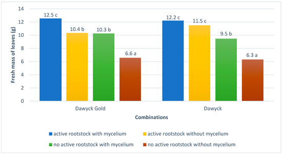 The fresh weight of beech leaves was the highest for Dawyck Gold with both treatments at the same time and for Dawyck in combination with active rootstock and the absence of fungus. The leaves of beech plants without these treatments had the lowest weight (Figure 5).