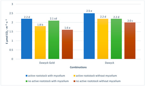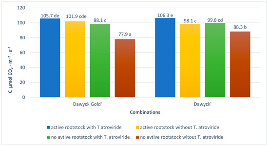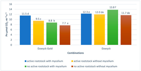 A higher net leaf photosynthesis level (Pn) was found for Dawyck compared to Dawyck Gold (Figure 6). Dawyck Gold had the best Pn index when both treatments were applied simultaneously, while Dawyck had the best Pn index only when the rootstock was treated with Trichoderma atroviride. The lowest value of this parameter was found for both cultivars without these two treatments.