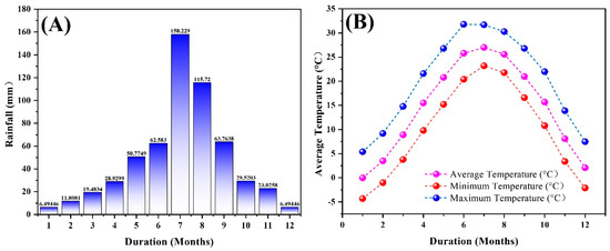Annual rainfall (mm) (A) and annual temperature (°C) during long-term experimental period (B).