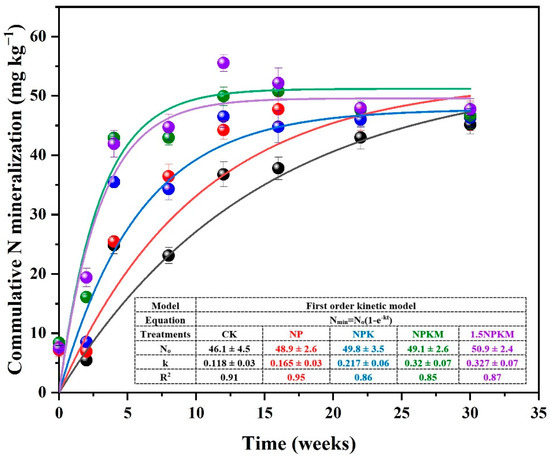 The mineralized N in the manure applied treatments (NPKM and 1.5NPKM) was always higher than that in other treatments (Figure 2), suggesting that the treatment with manure application supplied more available N to the crops than the control treatment, highlighting the importance of organic amendments to enhance soil fertility [31,32]. Nitrogen mineralization is an essential process for crop nutrition [27]. Refs. [33,34] reported that the application of combined (organic and inorganic) fertilizers increased the N supply capacity of the soil, consequently enhancing N mineralization. Ref. [35] reported that both N0 and NMR were highest in a treatment to which manure had been applied for more than 10 years. However, our results revealed that it was the constant k but not the potential that led to the differences among the treatments (Figure 2). The k value in the 1.5NPKM treatment was 3 times that of the CK treatment, suggesting that high-fertility treatments supply available N to the crops in a timely manner, whereas the sterile treatment mineralized slowly despite having similar potential. The curvilinear pattern of mineralized N indicates the different pools of organic C that are released at different rates. The significant difference in mineralized N during the first 16 weeks, and the similar mineralized N values during later weeks (16–30) suggested that the labile and intermediate portions of the organic N fraction led to a varied k and then varied N mineralization among treatments (Figure 2). These results are in agreement with previous findings in which the temporal release of NH4+-N decreased because of the lower mineralization potential at a later stage of incubation, which is an indication of the recalcitrant part of organic amendments, but the concentration of NO3−-N increased due to the rapid nitrification process [10].