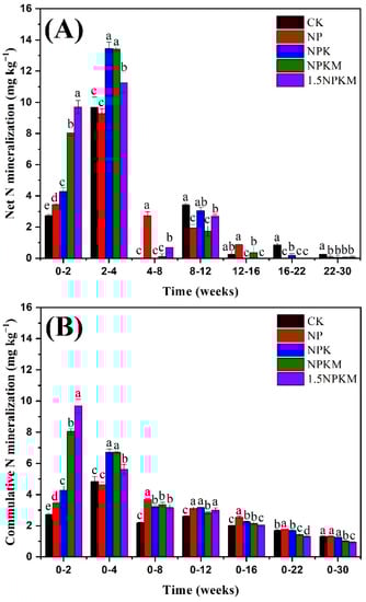 Regardless of the treatments, the net NMR was the highest at 2–4 weeks, which was followed by that at 0–2 weeks and that at 8–12 weeks (Figure 3A). Among the treatments, those with NPKM and 1.5NPKM showed higher net NMR early in incubation, during weeks 2–4. After 12 weeks, the NMR was higher in CK and NP treatments than in other treatments (NPK, NPKM, and 1.5NPKM). Similar to the net NMR, cumulative NMR was the highest during the first four weeks (Figure 3B). Compared with the CK treatment, the fertilized treatments exhibited significantly higher cumulative NMR. There was no significant difference in the cumulative mineralization rate among all treatments after 16 weeks.