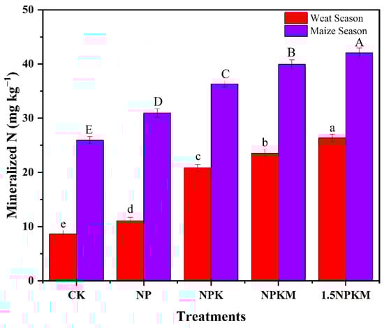 The actual amount of mineralized N or N supplied to the wheat or maize was predicted during the whole growing season according to the mineralization N potential, weather conditions, and growing period, as shown in Equation (4). The mineralized N was significantly higher for manure applied treatment than for only chemical fertilizer applied treatment, which was further higher than for no-fertilization treatment during both the wheat and maize growing seasons (Figure 4). The treatments supplied 8.67–26.41 mg N kg−1 to wheat and 25.9–42.11 mg N kg−1 to maize during the corresponding whole season.