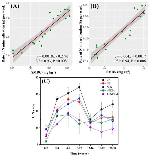 A significant correlation was identified between the mineralized N rate and soil microbial biomass (SMBC: R2 = 0.93, p = 0.008; SMBN: R2 = 0.94, p = 0.006) (Figure 5A,B). Likewise, the SOC and TN ratio (C:N) was significantly higher in the CK treatment than the 15.NPKM treatment during the 30 weeks. The C:N increased with time during the first 2–12 weeks and then decreased during weeks 12–30 (Figure 5C).