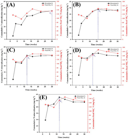 Fixed ammonium accounted for 16–19% of the total N in the treatment at each sampling time during the incubation, which indicated that it is an important N pool in the soil and was used as a source for the mobilization of NH4+ as well as a pool for the immobilization of NH4+. During the first 8 weeks, the fixed NH4+ decreased linearly with increasing mineralization (Figure 6). It suggested that we might overestimate N mineralization at early stages because NH4+ can originate not only from mineralization but also from the release of fixed NH4+ from soil clay. After 8 weeks, the fixed NH4+ increased with increasing mineralized N. We hypothesize that the NH4+ fixation process occurred after the NH4+ content in the soil reached a specific content. The authors of [40] found that soil containing 2:1 of clay minerals had a greater capacity to fix NH4+. It was reported that an inconsistent trend of fixed NH4+ might be possible due to the nitrifying bacterial population and that the heterotrophic biomass can be a major cause of increased fixed NH4+ from the interlayer spaces of clay minerals [41]. Moreover, the highest value of fixed NH4+ was observed at the same time point as the most mineralized N (N0) at all treatments. After their peak points, the N mineralization and fixed NH4+ both showed a parallel trend. These results suggested that the fixed NH4+ is a sink and source of exchangeable NH4+ that plants assimilate, thereby contributing to optimum plant growth and fertility status. The results revealed an asymptotic relationship between N mineralization and fixed NH4+. Therefore, it is important to consider a part of the fixed NH4+ in future research on N mineralization and availability.