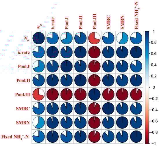Significant positive correlations were identified between the N mineralization rate and N pools (I and II), SMBC, SMBN and fixed NH4+ (Pool I: r = 0.69; Pool II: r = 0.86; SMBC: r = 0.81; SMBN: r = 0.60; Fixed NH4+: r = 0.78) (Figure 7). In contrast, significant negative correlations were identified between Pool III and potential mineralized N, SMBC, SMBN and fixed NH4+ (N0: r = −0.70; Pool I: r = 0.96; Pool II: r = 0.97; SMBC: r = 0.94; SMBN: r = 0.97; Fixed NH4+: r = 0.94).