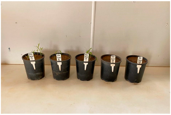Echinochloa colona seedlings in response to flumioxazin doses (Left to Right: Flumioxazin doses are in increasing order: 0, 15, 30, 60, and 120 g ai ha−1.