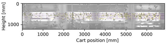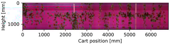 Figure 1 shows the panoramic image of the synthetic vineyard developed using the acquired sequence of images and their position measured by the encoder. Furthermore, the acquisition of the frames with a suitable purple background allows an effective segmentation based on color differences, as depicted in Figure 2.