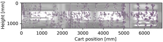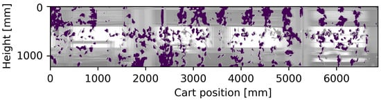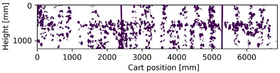 With the same strategy adopted for the ground truth, the depth images were treated in order to generate the panoramic image of the vineyard model (Figure 8), from which the binary profile of the vineyard was then extracted by applying the double thresholding (Figure 9).