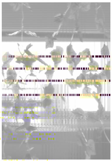 In [], a monocular monochrome camera with two different optical band-pass filters was used. The system acquires both UV and NIR bands; the segmentation is obtained by looking for the optimal threshold of the histogram of gray values of the images: vegetation is highlighted by working in the near-infrared band. In fact, to analyze the vigor level of a plant, the NDVI (Normalized Difference Vegetation Index) is often used, calculated as the ratio between the difference and the sum of the radiations reflected in the near-infrared and in the visible red. Still, based on color segmentation using a camera in the visible band, ref. [] trivially used a magenta canvas behind the vineyard row to improve the contrast and determine the green leaf’s positions. The proposed system is difficult to adopt in real applications but could be considered to extract the ground truth in a laboratory setting.
