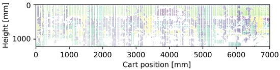 The vineyard wall occupies only a part of the planar circular sector covered by the LIDAR. The measurements that refer to the portion of sky or ground are discarded: this involves a considerable waste of time and, as the LIDAR moves while measuring, a non-uniformly spaced sampling. Therefore, it may be useful to choose LIDARs that subtend limited measurement angles or with a high scanning frequency or devices that simultaneously conduct several equally out of phase measurements. These choices involve a higher cost of equipment. In the following laboratory test proposed, a cheap 2D LIDAR (Robotis LDS-01 []) was used that scans at 360°, with a resolution of 1°, at a frequency of 5 Hz. The LIDAR was mounted on the cart so that it scans the vertical plane orthogonal to the vineyard wall and to the ground, thus measuring a vertical band (or line, considering the width of the beam is very small compared to the context) of the vineyard wall. As anticipated, only about a hundred out of 360 readings per revolution subtend the part to be analyzed, resulting in a waste of data and introducing dead times between successive useful scans.