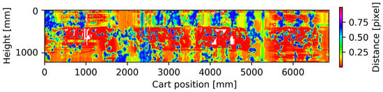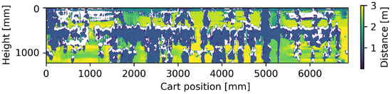 Moving the cart slowly with respect to the scanning time, it was possible to map the vineyard wall shape by accumulating successive distance measures. The rotary scanning combined with the displacement of the LIDAR results in the spatially distributed measurements in a spiral with a pitch proportional to the displacement speed: taking into account that many measurements will be discarded, the vineyard wall is scanned along segments with increasing inclination and spacing as the speed of the cart increases. Through a geometric transformation, the panoramic image is created (Figure 6, captured at 0.1 m/s), reporting the measured distances and attributing to each measurement the area on the vineyard wall plane of a cone with an aperture equal to the scanning resolution, which is a spot of a few centimeters. Finally, knowing the distance of the LIDAR from the vineyard wall and setting a thickness to it, its profile shape was estimated by binarizing the distance map by placing a double threshold (minimum and maximum distance of leaves from LIDAR) on the read values, as shown in Figure 7.