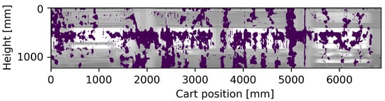 For the tests carried out, the camera was placed in such a way as to capture the entire height of the vineyard model, resulting in a resolution of the panoramic depth map of about 600 pixels per meter vertically and 400 horizontally. In this case, the map is spatially continuous, and the test results are practically invariant with speed, at least until the frame rate chosen for a given cart speed ensures that adjacent or overlapping vertical portions of the vineyard are captured between consecutive frames. Some areas present undefined values, shown in white in Figure 8: these measures are all on the same side of the vegetation and are due to the occlusion of the contours for one of the two stereo sensors causing an underestimation of the leaf area. As can be seen in detail in Figure 10, the measurements report a TPR of 84% and FPR of 14% with respect to the reference ground truth with a cart speed of both 0.1 m/s and 0.6 m/s; moreover, this system ensures a complete mapping of the area to be measured.