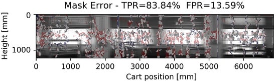 Numerically, comparing the data shown in Figure 5 with the ground truth (2), in the best case of 350 lines/m, i.e., sampled at 30 Hz at a speed of 0.1 m/s, we obtain a TPR of 83% with an FPR of 13%. Increasing the speed, for example, to 0.6 m/s, the measurement resolution passes to 60 lines/m bringing the indices to 56% for TPR and 25% for FPR.