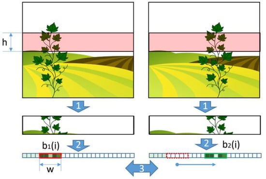 The algorithm proposed to estimate the presence or absence of vegetation through a monocular camera takes its cue from a 3-D camera strategy [,]: in the latter, the estimation distances come from a pair of images acquired simultaneously by two separate cameras placed at a known distance one from the other. The same strategy can, however, also be adopted using a single camera that is translated horizontally and acquires a couple of images in two different positions. The only difference between the two systems lies in the fact that in the first case, the distance between the twin cameras is known a priori, while in the second one, the distance could be not constant and, in any case, it must be estimated through a suitable detection system.