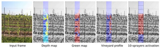 Under the hypothesis of being able to recognize the vegetation just by its green color, some works are proposed that use a monocular camera followed by segmentation algorithms based on color recognition. In [], an automatic threshold algorithm for separating canopy from the sky, based on edge detection, is proposed. The authors of [] propose a foliage detection algorithm (FDA) followed by a grape detection algorithm (GDA): the FDA operates in the RGB color space and allows a first outline of the acquired image, while they propose three variants of the GDA based on the recognition of textures once the edges of the image have been extracted. A target sprayer for orchards that identifies the crown by extracting the green color in the HSV color space followed by a morphological erosion operation, aiming the camera upwards at an angle of 30° to capture the entire crown while having the sky as a background, is described in []. With a similar approach, the authors of [] placed the camera facing the sky near the ground and analyzed the correlation between the leaf area of the vineyard measured by the segmented image with its volume or using a professional instrument for measuring LAI [], whose operating principle is the measurement of UV-blue (320–490 nm band) instead of green. The segmentation based on color information always suffers from the context, typically of the same color (grass of the ground or adjacent rows). They obviate this by pointing the camera upwards instead of orthogonal to the wall to be analyzed. This, however, reduces the vertical resolution and limits the use of several nozzles.