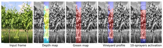 The proposed control system was described with a high-level language and evaluated on a desktop PC, simulating the input stream with the video sequences collected in the vineyard. The optimization of the parameters of the control algorithm took place in a qualitative way by superimposing on the videos an animation with the calculated depth map, with the foliar profile identified or by highlighting the areas that would be sprayed until the desired result was obtained. Figure 15 and Figure 16 show two sample frames of the collected videos, one acquired in mid-April and one in June; next to them are represented, superimposed in transparency, the intermediate maps calculated with the simplified algorithm proposed for the prototype: depth map followed by binary maps of green areas, of the estimated vineyard profile and the areas to be treated.