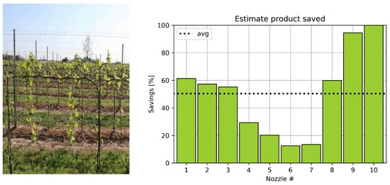 With an adequate time interval on which to conduct the statistics, the overall savings value can be used, for example, as an indicator of the return on investment per season, while the statistics for each nozzle provide clear information on the areas that did not require treatment and, therefore, unnecessary product dispersion was avoided. In order to characterize the efficiency of different possible configurations of the system, it is possible with the proposed measure to compare the savings obtainable on the same vineyard by varying the number of nozzles used.