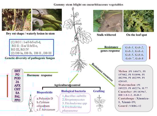 Molecular diagnostic techniques have been used in the resistance breeding of GSB in Cucurbitaceous crops [,,]. Babu et al. (2015) studied the genetic characterization and made a genetic profile of D. bryoniae isolates infecting watermelon and other Cucurbits in Florida and Georgia through internal transcribed spacer (ITS), RFLP, and RAPD analysis []. To detectresistance and susceptibility of melons to GSB, in vitro leaf inoculation combined with molecular marker-assisted selection was used []. MAS-based (Marker-assisted selection) pyramiding multiple GSB resistance genes into Cucurbit cultivars (such as melons) has been reported asan effective strategy to develop a broad resistance spectrum and to increase the duration of GSB resistance for breeding Cucurbitaceous vegetable crops [].