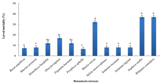 Percent mortality (mean ± SE; n = 10) of 3rd instar larvae of fall armyworm Spodoptera frugiperda at 72 h post-exposure to 20% methanolic extracts of different plant species. Alphabets at bar tops indicate significant differences among the botanical treatments (one-way ANOVA; HSD at α = 0.05).