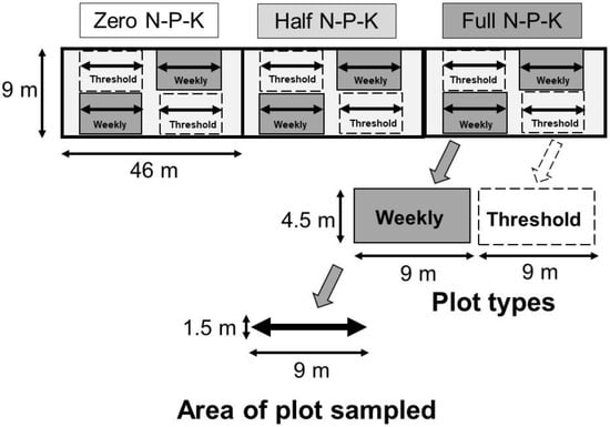 Within each commercial field, a 9.1 m wide by 138 m long area was separated equally into three sections, and each section was randomly selected to receive one of the three fertilizer treatments (Figure 1; Table S2). Within each fertilizer treatment, four 4.5 m wide by 9 m long plots were designated as either the weekly insecticide program or the action threshold-based program (Figure 1). Thus, in each field, there were a total of 12 plots. Six plots received an insecticide application every week for the entire duration of the onion growing season regardless of thrips densities, while six plots received insecticide applications based only on an action threshold. All plots were positioned well within the center area of each fertilizer treatment to reduce the risk of sampling in areas where nutrients might have moved between treatments or from soil surrounding the trial. All data were taken along a transect in the center of each plot (1.5 m wide × 9 m long) (Figure 1).