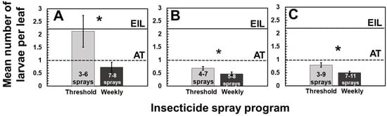 Mean (±SEM) number of T. tabaci larvae per leaf over the duration of our sampling in onions treated with insecticides following either an action threshold program or weekly application program in 2019 (A), 2020 (B), and 2021 (C) in New York (USA). Because thrips densities were not significantly affected by fertilizer rate or an interaction between fertilizer rate and insecticide program, data were pooled across all three fertilizer treatments. Asterisks indicate significant differences between spray programs (Tukey’s HSD, p < 0.05). The range in number of sprays applied in each program in each year are denoted within each bar. The economic injury level (EIL) of 2.2 thrips larvae per leaf is denoted by a solid line, and the action threshold (AT) of 1 thrips larva per leaf is denoted by a dotted line.