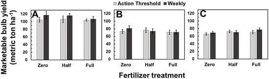 Mean (±SEM) marketable onion bulb yield for each fertilizer rate and insecticide program combination in 2019 (A), 2020 (B), and 2021 (C). There were no significant differences among treatments within each year (Tukey’s HSD, p > 0.05).