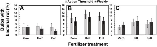 Mean (±SEM) percent bulbs with symptoms of bacterial bulb rot in each fertilizer rate and insecticide program combination in 2019 (A), 2020 (B), and 2021 (C). There were no significant differences among treatments within each year (Tukey’s HSD, p > 0.05).