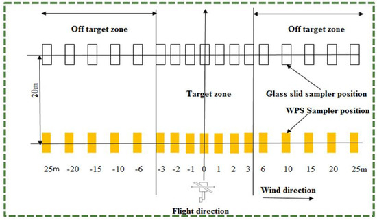 Both types of the sampler are arranged in two separate lines 20 m apart, as shown in Figure 1. On both lines, 3 m from the line of travel of the UAV (right and left sides) were marked as target zone and the off-target zone, keeping in view the UAV sprayer’s spray swath width and the spray bar length, which was 4.5 m.
