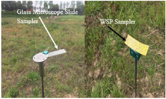 Glass microscope slides are another kind of sampler that have been applied to sample target and off-target spray deposition [21,22]. The easy handling and use of less volume of solvent for washing the glass slides made them famous as a deposition sampler; however, a lower deposition capacity has been reported if they are placed at an angle to the horizontal plane [30,40]. There is a strong relationship between deposition capacity and angle, such as low vapor pressure spray pesticides dissipating from the glass slide’s surface [30].