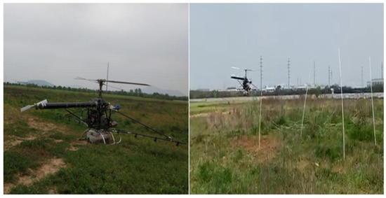 A UAV sprayer of a single rotor (Freeman-200 model, Feirui Company, Zhenjiang, China) was applied as a spraying system. The key description and parameters of the UAV sprayer are shown in Table 1. The UAV sprayer comprises a rectangular-type liquid tank, pump, water pipe, spray lances, spray nozzle, and other components. The spray nozzle was a TeeJet TT110015, which has larger droplets for less drift with a working pressure between 15 and 90 PSI, and a total of nine nozzles equally spaced (50 cm) at spray lances and positioned perpendicular to the UAV axis with downward orientation [12].