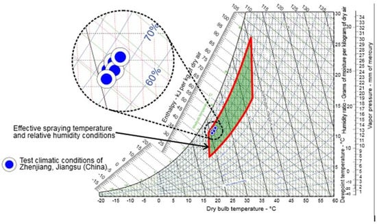 Metrological monitoring was performed by an automatic portable weather station (TYD-ZS, Beijing Hongchangxin Technology Co., Ltd., Beijing, China), which had a working height of 2.5 m. Table 3 shows the metrological situation and parameters at the experiment site. Figure 4 shows the representation of the climatic conditions on the psychrometric chart. The experimental test’s climatic conditions were present in the effective temperature and humidity zone on the psychrometric chart. The outlook of the field used for the test is shown in Figure 5.