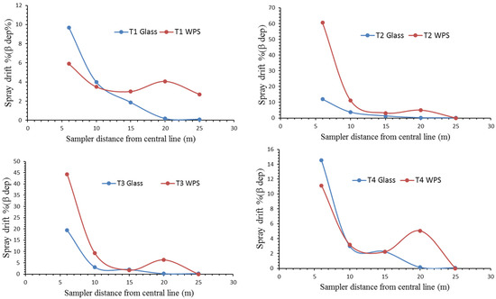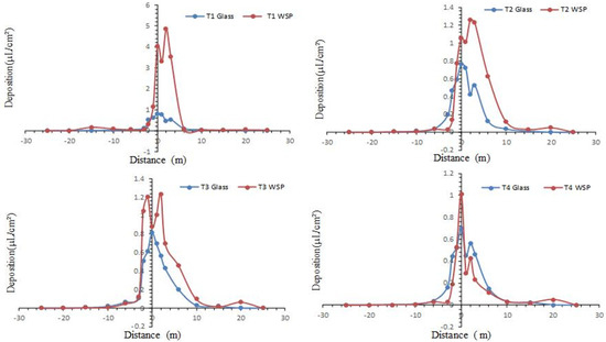 As the flight speed and height increase, the droplet deposition difference between WSP and glass strip significantly decrease at zero position during the treatment T4. The glass strip recorded high deposition in the target zone with a range of 0.164 to 0.699 µLcm−2, whereas in the same condition, WSP recorded from 0.031 to 1.013 µLcm−2. At the line of travel, the glass slides sampler recorded the spray deposition 0.79, 0.76, 0.81, and 0.70 µLcm−2 for treatment T1, T3, and T4 respectively, whereas the WSP sampler recorded 4.03, 1.0.1, 0.88, and 1.03 µLcm−2. As the flight height and flight speed increased, the droplet split and lost more energy due to this lower performance to escape from the glass strip and provide a better result.