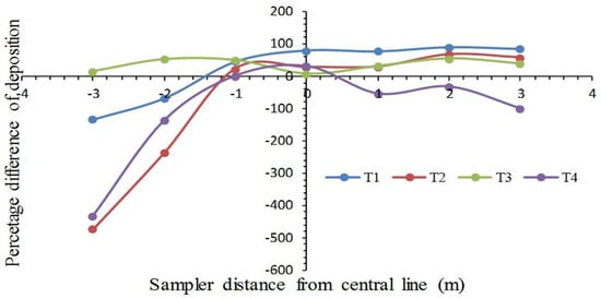 Figure 7 presents the percentage difference of deposition of water-sensitive paper sampler and glass microscopic strip sampler in a target zone. At T3, the percentage difference of deposition recorded by both types of sampler outcomes is relatively close to each other, and the difference ranges from 14% to 55%. This shows that both samplers gave somewhat similar outcomes at 5 m flight height and 2 ms−1 speed. The glass strip recorded a high deposition in the target zone with a range of 99% to 493%, whereas the WSP recorded from 0.031 to 1.013 µLcm−2 during the treatment T4. Only at x = 0, WSP recorded a 30% higher deposition than the glass slide sampler. The water-sensitive scanning software also influences the final deposition results as DepositScan software neglects the droplets having a diameter less than 42.3 µm [41].