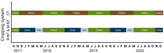 Continuous cotton cropping system sequences for conventional tillage, winter fallow (CT), no-tillage with rye cover (R-NT), and no-tillage with mixed species cover (M-NT) at the Agricultural Complex for Advanced Research and Extension Systems, Lamesa, TX, USA from 1 October 2017 through 31 December 2020. Created with Biorender.com (accessed on 26 February 2022).
