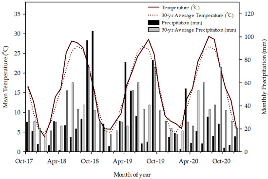 Mean monthly temperature and total monthly precipitation from rainfall and irrigation events and 30-year (1991–2020) climate averages at the Agricultural Complex for Advanced Research and Extension Systems, Lamesa, TX, USA from 1 November 2017 through 30 November 2020 (National Oceanic and Atmospheric Administration—National Centers for Environmental Information, 2022).