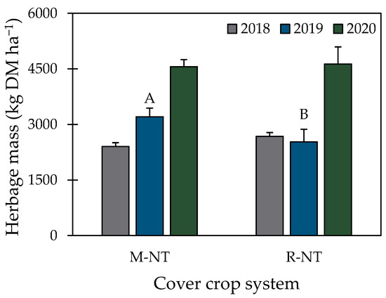Rye (R-NT) and mixed species (M-NT) cover crop herbage mass (DM, dry matter) produced in 2018, 2019, and 2020 in Lamesa, TX, USA. Letters indicate significant differences between cover crop treatment means within year at p < 0.05. Differences were not determined in 2018 and 2020. Error bars represent standard error of the sample mean.