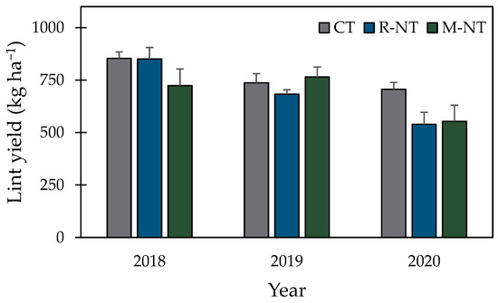 Cotton lint yield in the 2018, 2019, and 2020 growing seasons in Lamesa, TX, USA. Differences were not determined in any year at p < 0.05. Error bars represent standard error of the sample mean. Conventional tillage winter fallow, no-tillage rye cover, and no-tillage mixed species cover are represented as CT, R-NT, and M-NT, respectively.