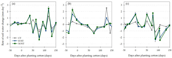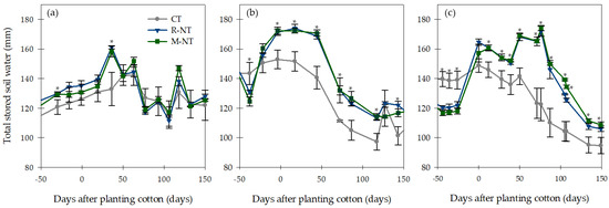 Changes in soil water in (a) 2018, (b) 2019, and (c) 2020 at the Agricultural Complex for Advanced Research and Extension Systems, Lamesa, TX, USA. Negative values on the x-axis represent days prior to planting cotton. Stars (*) represent significant differences between treatments at p < 0.05. Conventional tillage winter fallow, no-tillage rye cover, and no-tillage mixed species cover are represented as CT, R-NT, and M-NT, respectively.