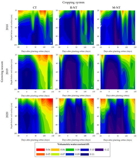 Volumetric water content (VWC) at depth for each cropping system (columns) based on days after planting cotton in each growing season (rows) in (a–c) 2018, (d–f) 2019, and (g–i) 2020 at the Agricultural Complex for Advanced Research and Extension Systems, Lamesa, TX, USA for 0- to 100 cm below the soil surface. Negative values on the x-axis represent days prior to planting cotton. Conventional tillage winter fallow, no-tillage rye cover, and no-tillage mixed species cover are represented as CT, R-NT, and M-NT, respectively.
