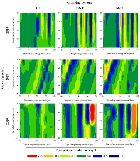 Changes in soil water at depth followed similar patterns in 2018 and 2020 but were not similar in 2019 (Figure 8). In 2018, there was a 23% greater increase in the change in soil water with R-NT and M-NT compared to CT between −30 and −20 DAP to a 50 cm depth (Figure 8a–c). Patterns of positive and negative changes in soil water at depth were similar between all treatments in 2018, although the degree of change was greater in R-NT and M-NT than CT from 30 to 150 DAP. The greatest positive and negative changes in soil water occurred approximately 90 cm below the soil surface in the M-NT system at 77 (−0.52 mm day−1) and 118 (+0.39 mm day−1) DAP. From −50 to −10 DAP in 2019, positive increases in change in soil water from 20 to 30 cm below the soil surface were similar for all the treatments, averaging 127% increases in soil water prior to cotton planting. However, from −30 to −10 DAP, negative changes in soil water from 30 to 60 cm were 18% greater in R-NT and M-NT compared to CT. Deeper in the profile, positive changes in soil water were 21% greater at depth in R-NT and M-NT compared to CT at decreasing depth (90 to 20 cm below the soil surface) from −50 to 25 DAP. A similar trend occurred in CT (22% increase) from 50 to 125 DAP that was not observed to the same degree in R-NT and M-NT. In 2020, greater changes in soil water at depth were observed overall in R-NT and M-NT compared to CT (Figure 8g–i). From −30 to 0 DAP, 12% increases in soil water were observed throughout the profile of R-NT and M-NT than CT. The pattern continued at 45 to 50 (8%) and 90 to 105 (10%) DAP. At approximately 100 DAP, R-NT and M-NT had 16% negative changes in soil water from 75 to 100 cm and 90 to 100 cm, respectively. From 120 to 150 DAP, 32 and 24% decreases in soil water occurred in R-NT and M-NT from 20 to 65 and 20 to 90 cm below the soil surface, respectively, compared to CT.