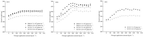 With the increase in the nitrogen application rate, the maize kernel weight (Figure 2) and kernel number per ear (Figure 3) increased rapidly and then tended to remain flat. SPSS was used for nonlinear regression fitting of the linear plus platform model to obtain the amount of nitrogen application required for kernel weight (Table S1) and kernel number per ear (Table S2) to reach the inflection point. Under the same nitrogen application rate, with the increase in planting density, the maize kernel weight and the number of grains per ear decreased.