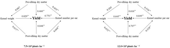 The correlation analysis between the number of grains per ear, kernel weight, dry matter accumulation, and yield in the increasing yield with nitrogen application (Figure 4) shows that the number of grains per ear and kernel weight significantly positively correlated with yield under the two density conditions. The correlation coefficient of kernel weight under the density of 7.5 × 104 plants ha−1 was higher, and the correlation coefficient of kernel number per ear under the density of 12.0 × 104 plants ha−1 was higher. Dry matter accumulation before silking positively correlated with the kernel number per ear but not kernel weight. The dry matter accumulation after silking significantly positively correlated with the kernel number per ear and kernel weight. The accumulation of dry matter before and after silking significantly positively correlated with yield, and the correlation coefficient of dry matter after silking was higher. The correlation coefficient between the pre-silking dry matter accumulation and yield under a density of 12.0 × 104 plants ha−1 was higher than that under a density of 7.5 × 104 plants ha−1. Therefore, when the maize is densely planted and producing high yields, the accumulation of dry matter before and after silking should be the primary point of focus to improve the kernel weight, kernel number per ear, and yield.