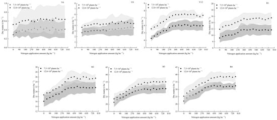 The dry matter weight in each growth stage increased first and then became stable with the increase in nitrogen application (Figure 6). From the V9 to the V12, from the V12 to the R1, from the R3 to the R5 and from the R5 to the R6, the average dry matter accumulation of 12.0 × 104 plants ha−1 increased by 13.9%%, 36.5%, 5.3%, and 51.0%, respectively, compared with that of 7.5 × 104 plants ha−1. The dry matter accumulation of 12.0 × 104 plants ha−1 was 2.4% lower than that of 7.5 × 104 plants ha−1 from the R1 to R5 stages.