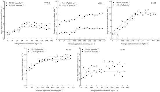 Effect of the nitrogen application rate on the dry matter accumulation in each period under different density conditions.