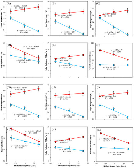 Environmental parameters and growth duration for different sowing dates before heading and after heading in 2019 (A–F) and 2020 (G–L). Note: Red dots in the plot indicated environmental parameters at before heading, blue dots in the plots indicated environmental parameters at after heading.