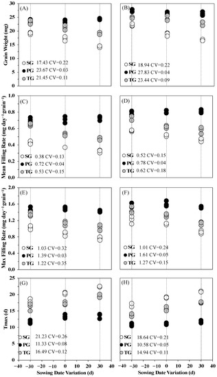 Grain filling characteristics of grains located on different positions and sowing dates of N7 (A,C,E,G) and N9108 (B,D,F,H). Note: White dots represents grains located on secondary branches (SG); Black dots represents grains located on primary branches (PG); Grey dots represents total grains (TG). CV represents covariance of 3 biological replicates. N7 and N9108 represents Nanjing 7 and Nanjing 9108, respectively.