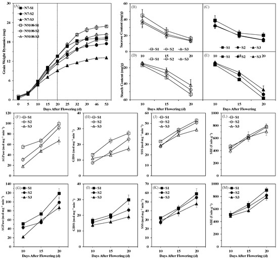 - Yang, J.; Zhang, J.; Wang, Z.; Zhu, Q.; Liu, L. Activities of enzymes involved in sucrose-to-starch metabolism in rice grains subjected to water stress during filling. Field Crops Res. 2003, 81, 69–81. [Google Scholar] [CrossRef]