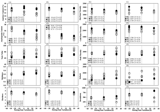 Cooking and taste quality parameters and RVA characteristics of grains located on different positions and sowing dates of N7 (A–J) and N9108 (K–T). Note: White dots represents grains located on secondary branches (SG); Black dots represents grains located on primary branches (PG); Grey dots represents total grains (TG). CV represents covariance of 3 biological replicates. N7 and N9108 represents Nanjing 7 and Nanjing 9108, respectively.
