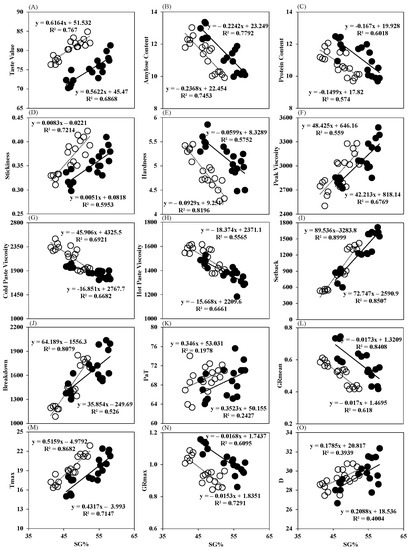 Relationship between physiochemical properties, texture properties, RVA profiles and filling characteristics with ratio of grains located in secondary branches (SG%). (A–E): Cooking and taste quality; (F–K): RVA parameters; (L–O): grain filling parameters. Note: Black dots represented the performance of N7 and white dots represented the performance of N9108.