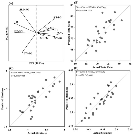 PCA analysis among taste value characteristics of grains located on different position (A) and of the population and the Stepwise regression analysis of taste value (B), hardness (C) and stickiness (D). Note: H.D represents hardness of rice; H.D-PG represents hardness of grains located in primary branches (PG); H.D-SG represents hardness of grains located in secondary branches (SG); S.T represents hardness of rice; S.T-PG represents hardness of PG; S.T-SG represents hardness of SG; T.V represents hardness of rice; T.V-PG represents hardness of PG; T.V-SG represents hardness of SG; SG% represents ratio of SG per unit area.